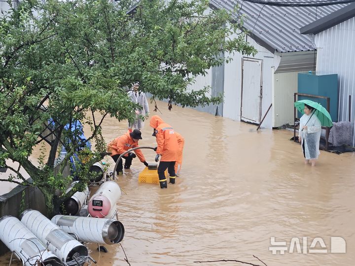 [진천=뉴시스] 17일 오전 10시55분께 충북 진천군 초평면 중석리의 한 도로에 폭우로 인한 침수피해가 발생해 소방당국이 배수작업을 벌이고 있다. (사진=충북도소방본부 제공) 2025.07.17. [email protected]