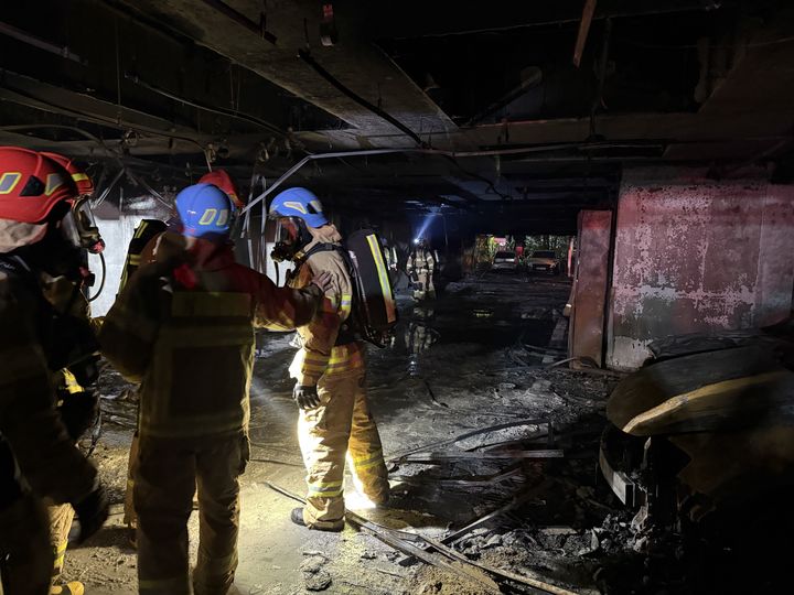 [광명=뉴시스] 17일 오후 9시5분께 경기도 광명시 소하동의 아파트 1층 필로티 주차장에서 불이 나 3명이 심정지 상태로 인근 병원으로 옮겨졌다. 사진은 화재 현장에 진입하는 소방대원들의 모습. (사진=경기도소방재난본부 제공) 2025.07.17. [email protected]