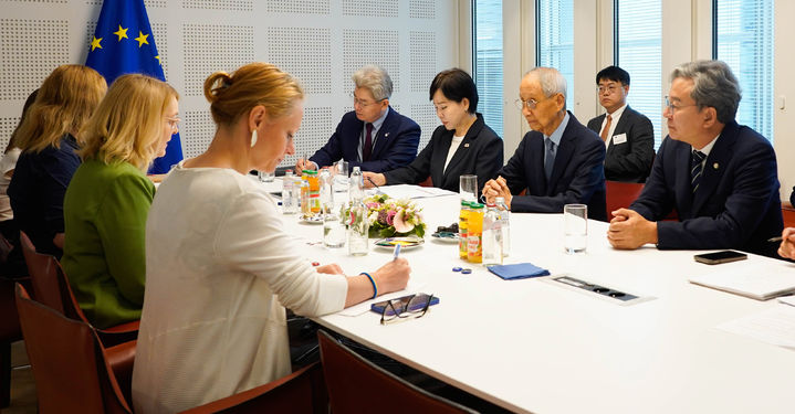 [서울=뉴시스] 추상철 기자 = 윤여준 전 환경부장관을 단장으로 하는 대통령 유럽연합(EU) 특사단이 16일(현지 시간) 벨기에 브뤼셀 유럽의회에서 크리스텔 샬데모세 유럽의회 부의장과 면담을 하고 있다. (사진= 외교부 제공) 2025.07.17. [email protected] *재판매 및 DB 금지