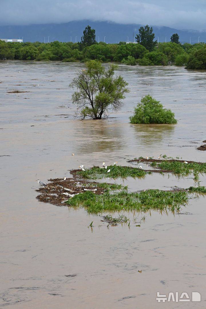 [평택=뉴시스] 김종택 기자 = 경기 남부와 충청지역에 호우경보가 발효된 17일 경기 평택시 안성천 군문교 인근 노을생태문화공원 산책로가 흙탕물에 잠겨 있다. 2025.07.17. [email protected]