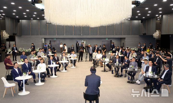 [부산=뉴시스] 하경민 기자 = 박형준 부산시장이 17일 부산 부산진구 부산상공회의소 2층 상의홀에서 '부산 상용근로자 100만 시대 달성'을 기념해 제조업, 투자기업, 고용우수기업, 청끌기업 등 지역을 대표하는 기업인 40여 명과 간담회를 갖고 있다.