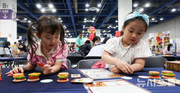 [서울=뉴시스] 김선웅 기자 = 17일 서울 강남구 코엑스에서 열린 2025 보드게임콘에서 어린이들이 햄버거 만들기 보드게임을 체험하고 있다. 2025.07.17. [email protected]