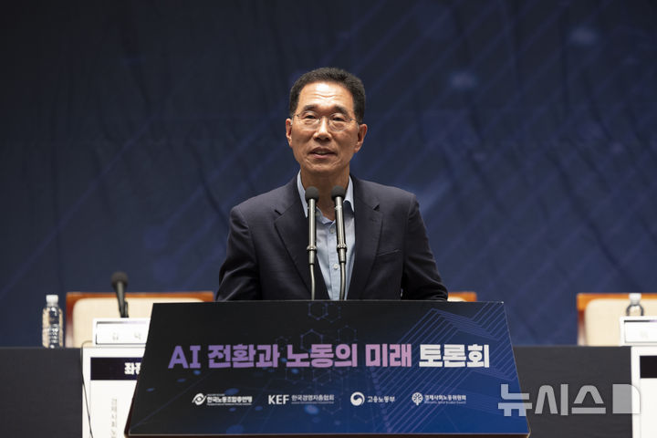 [서울=뉴시스] 김근수 기자 = 김주영 더불어민주당 의원이 17일 서울 중구 한국프레스센터 국제회의장에서 열린 AI 전환과 노동의 미래 토론회에서 축사를 하고 있다. 2025.07.17. [email protected]