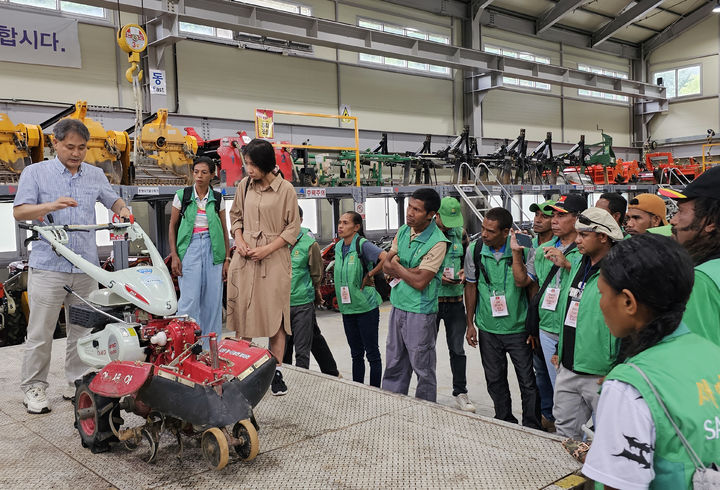 [서울=뉴시스] 새마을운동중앙회는 17일 지속 가능한 지구촌 새마을운동 추진을 위해 마련한 동티모르 초청 새마을교육 수료식을 개최했다고 밝혔다. 사진은 지난 15일 경기 용인시 농업기술센터를 방문한 동티모르 연수생들. (사진=새마을운동중앙회 제공) 2025.07.17. [email protected] *재판매 및 DB 금지