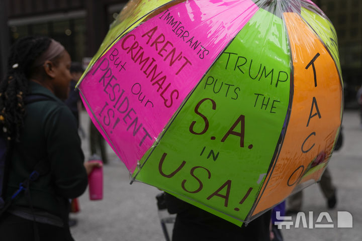 [시카고=AP/뉴시스] 17일(현지 시간) 미 일리노이주 시카고 데일리 광장에서 열린 ‘선한 소란은 계속된다’(Good Trouble Lives On) 전국 행동의 날 집회에서 한 시위자가 반트럼프 문구가 적힌 우산을 들고 있다. ‘선한 소란’은 2020년 7월 17일 타계한 미국의 인권운동가이자 하원의원이었던 존 루이스가 만든 표현으로, 부당함에 맞서 의미 있는 변화를 이루기 위해 평화롭고 비폭력적인 방식으로 함께 행동하는 것을 뜻한다. 2025.07.18.