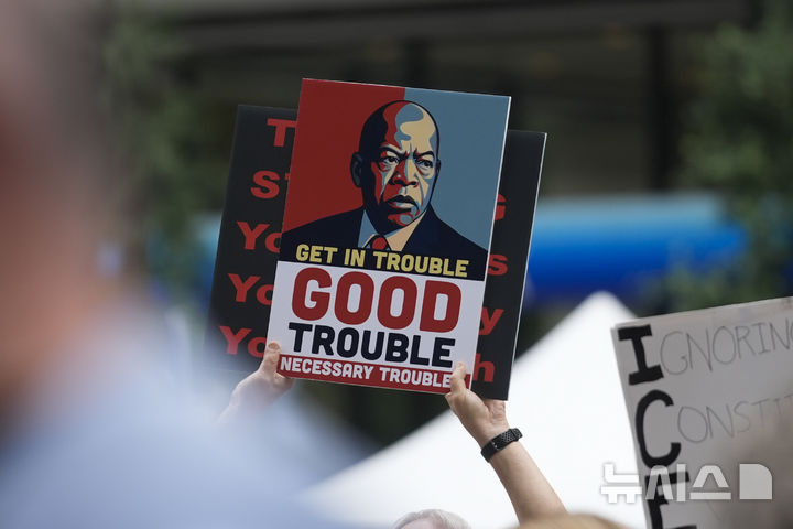 [시카고=AP/뉴시스] 17일(현지 시간) 미 일리노이주 시카고 데일리 광장에서 열린 ‘선한 소란은 계속된다’(Good Trouble Lives On) 전국 행동의 날 집회의 한 참가자가 존 루이스 전 하원의원 그림이 담긴 손팻말을 들고 있다. ‘선한 소란’은 2020년 7월 17일 타계한 미국의 인권운동가이자 하원의원이었던 존 루이스가 만든 표현으로, 부당함에 맞서 의미 있는 변화를 이루기 위해 평화롭고 비폭력적인 방식으로 함께 행동하는 것을 뜻한다. 2025.07.18.