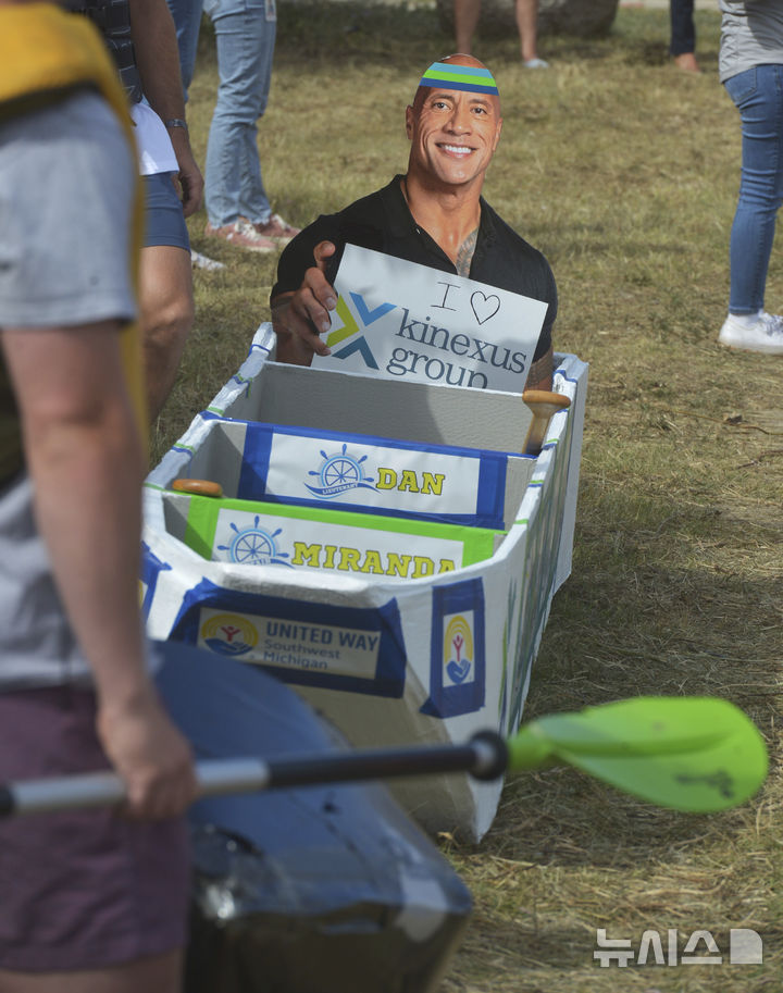 [세인트조지프=AP/뉴시스] 17일(현지 시간) 미 미시간주 세인트조지프강에서 열린 ‘록 더 보트'(ROCK THE BOAT) 골판지 보트 경주 대회에 참가한 한 팀의 보트에 배우 드웨인 존슨의 사진이 붙어 있다. 이 대회는 지역 기금 마련을 위해 열렸으며 기금은 인근 지역 주민을 돕는 데 사용된다. 2025.07.18.