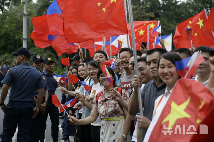 [마닐라(필리핀)=AP/뉴시스]2018년 11월20일 필리핀 마닐라의 중국 기업인과 학생들이 필리핀을 방문한 시진핑(習近平) 중국 국가주석이 타고 있는 차량 행렬을 향해 중국 국기를 흔들며 환영하고 있다. 중국 교육부는 18일 필리핀에 있는 중국 유학생들을 대상으로 한 일련의 범죄 발생에 따라 유학생들에게 안전 경고를 발령했다. 2025.07.18.