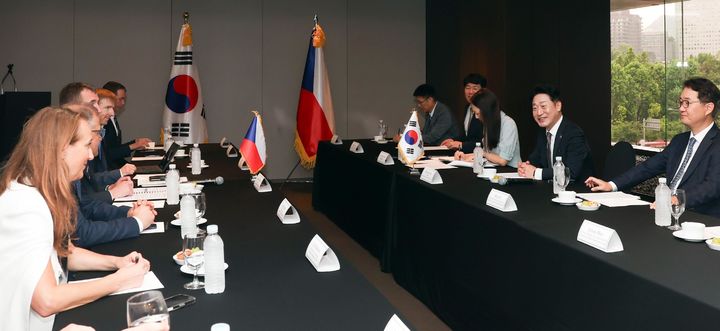[서울=뉴시스] 이호현 산업통상자원부 2차관이 18일 오전 서울 중구 플라자호텔에서 루카쉬 블첵 체코 산업통상부 장관과 면담하고 있다. (사진=산업통상자원부 제공) 2025.07.18. [email protected] *재판매 및 DB 금지
