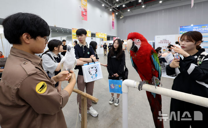 [대구=뉴시스] 이무열 기자 = 18일 대구 북구 엑스코에서 열린 제16회 대구진로진학 박람회를 찾은 학생들이 대경대학교 부스에서 특수동물 관련 설명을 듣고 있다. 2025.07.18. [email protected]