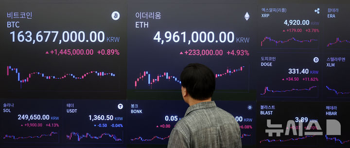 18일(현지시간) 미국 가상자산 거래소 코인베이스에서 리플은 전날보다 16.22% 오른 3.63달러에 거래되고 있으며 이더리움과 비트코인은 각각 8.81%, 1.80% 상승한 3650.09달러, 120,500달러 선에 거래되고 있다. 국내 가상자산 거래소 업비트에서 리플은 4900원대, 이더리움과 비트코인은 각각 4,970,000원, 163,850,000원대에 거래 중이다. 이날 서울 강남구 업비트 고객센터 시황판에서 코인 가격이 표시되고 있다. 2025.07.18. [email protected]