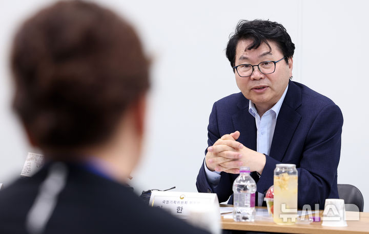 [서울=뉴시스] 김명원 기자 = 이한주 국정기획위원장이 18일 서울 종로구 정부서울청사 창성동 별관 국정기획위원회에서 열린 지난 정부 노동정책 희생 유족 간담회에 참석해 발언하고 있다. (공동취재) 2025.07.18. [email protected]