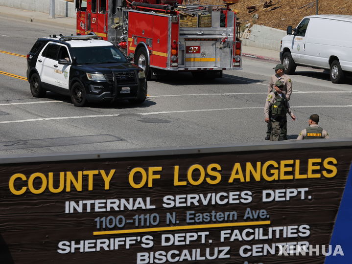 [로스앤젤레스=신화/뉴시스] 18일(현지 시간) 미 캘리포니아주 로스앤젤레스 카운티 보안관부 훈련 시설에서 폭발이 발생한 뒤 부보안관들이 경계 근무를 서고 있다. 당국은 이날 오전 발생한 폭발로 부보안관 3명이 숨졌다고 밝혔다. 사고 원인은 폭발물 처리반이 폭발물을 옮기던 중 발생한 것으로 추정된다. 2025.07.19.