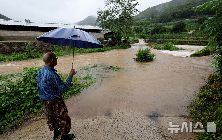 [대구=뉴시스] 이무열 기자 = 호우특보가 내려진 19일 대구 군위군 학암리 인근에서 한 어르신이 물에 잠긴 보행로를 바라보고 있다. 2025.07.19. [email protected]