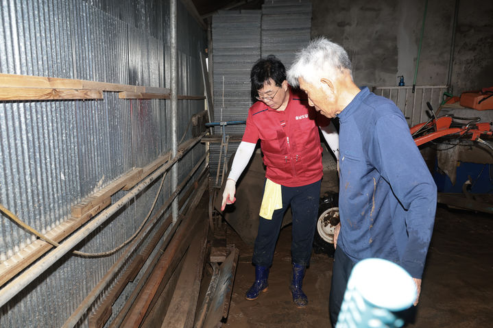 [서울=뉴시스] 조성봉 기자= 송언석 국민의힘 비상대책위원장 겸 원내대표가 19일 폭우로 수해를 입은 충남 예산 삽교읍 용동3리를 찾아 수해복구 봉사활동을 하고 있다. (사진=국민의힘 제공) 2025.07.19. [email protected]