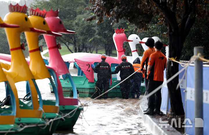[대구=뉴시스] 이무열 기자 = 강한 비가 내린 19일 대구 동구 동촌유원지 둔치 일대가 금호강 범람으로 침수되자 동부소방서 119 대원들이 오리배 유실을 막기 위해 밧줄을 이용해 묶고 있다. 2025.07.19. [email protected]