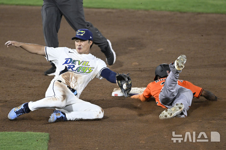 [탬파=AP/뉴시스] 탬파베이 레이스 김하성이 19일(현지 시간) 미 플로리다주 탬파의 조지 M. 스타인브레너 필드에서 열린 2025 메이저리그 볼티모어 오리올스와의 경기 9회 초 세드릭 멀린스의 도루에 대한 포수 송구를 받고 있다. 김하성은 3타수 2안타 1도루 1득점을 기록했고 팀은 4-3으로 승리했다. 2025.07.20.