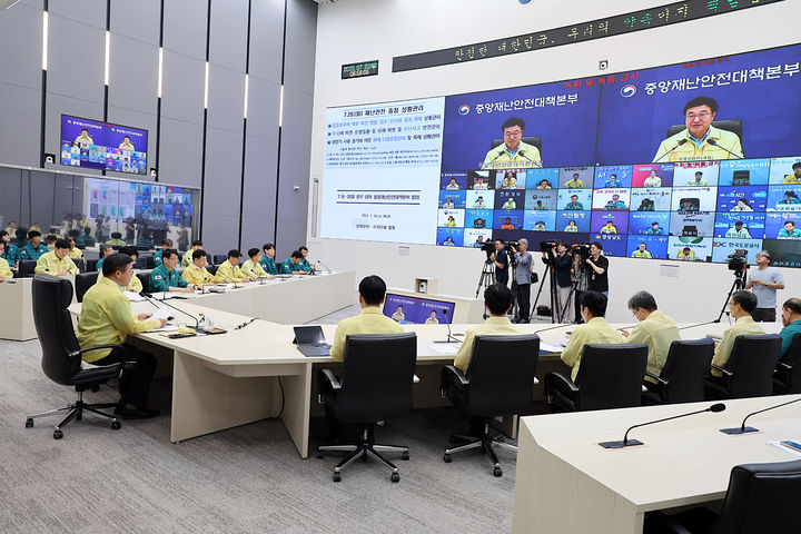 [세종=뉴시스] 강종민 기자 = 윤호중 행정안전부 장관이 20일 정부세종청사 중앙재난안전상황실에서 호우 대처 중앙재난안전대책본부 회의를 주재하고 있다.(사진=행안부 제공) 2025.07.20. [email protected] *재판매 및 DB 금지