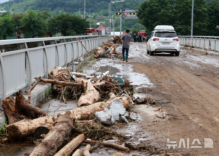 [가평=뉴시스] 이영환 기자 = 20일 오후 집중호우로 인해 홍수 경보가 발령됐던 경기 가평군 상면 대보교에 쓸려온 나무와 토사물이 치워져 있다. 2025.07.20. [email protected]