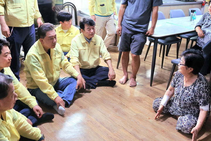 [서울=뉴시스] 김금보 기자 = 김병기 더불어민주당 당대표 직무대행 겸 원내대표가 20일 충남 아산시 호우피해 현장을 점검하고 있다. (사진=김병기 의원실 제공) 2025.07.20. [email protected] *재판매 및 DB 금지