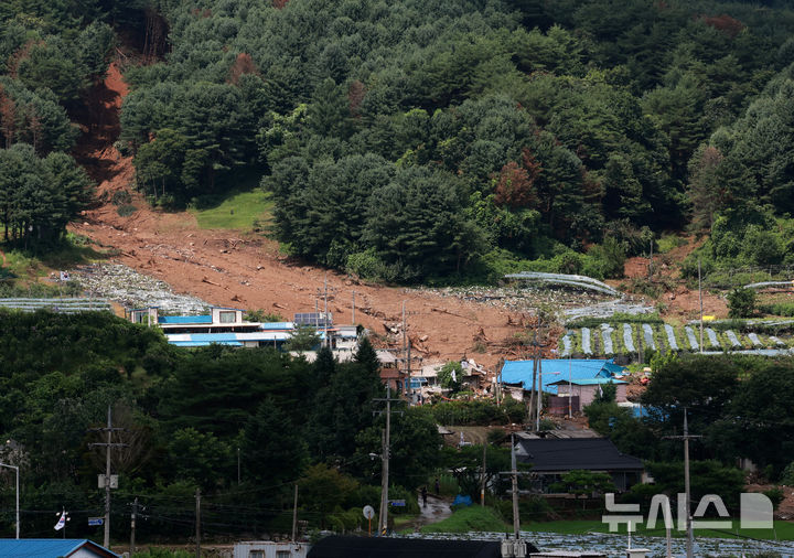 [가평=뉴시스] 이영환 기자 = 20일 경기 가평군 조종면 신상리 일대에 쏟아진 폭우로 산사태가 발생해 주택들이 파손되어 있다. 2025.07.20. [email protected]
