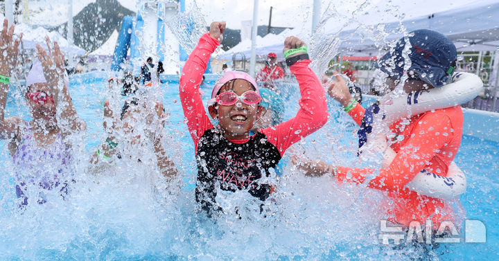 [서울=뉴시스] 추상철 기자 = 20일 오후 서울 종로구 광화문광장에 마련된 ‘2025 서울썸머비치’ 물놀이장에서 어린이들이 물놀이를 즐기며 더위를 식히고 있다. 2025.07.20. [email protected]