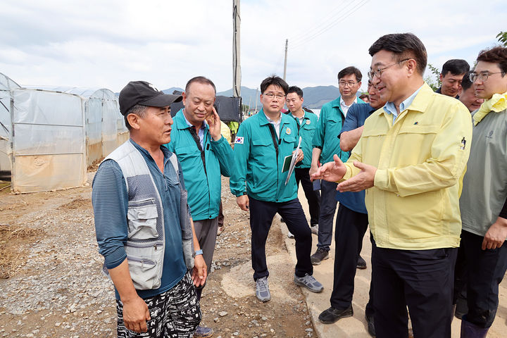 [서울=뉴시스] 조성우 기자 = 윤호중 행정안전부 장관이 20일 충남 예산군 신암면 일대 시설하우스 침수 피해 현장을 방문해 응급복구 상황 등을 점검하고 있다. (사진=행정안전부 제공) 2025.07.20. [email protected] *재판매 및 DB 금지
