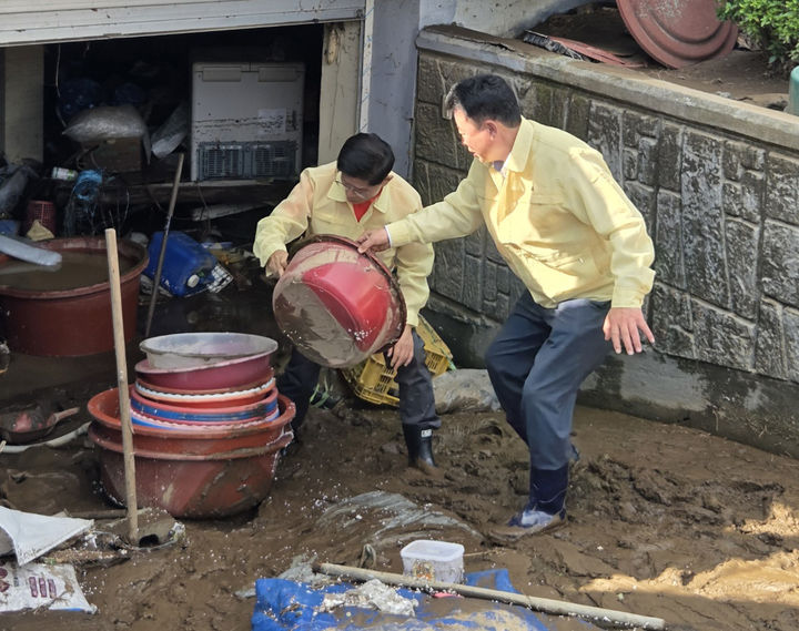 [서울=뉴시스] 김금보 기자 = 국민의힘 당대표 출마를 선언한 김문수(왼쪽) 전 국민의힘 대선후보가 20일 경기 가평군 호우 및 산사태 피해현장에서 피해상황을 살펴보고 있다. (사진=김문수 전 국민의힘 대선후보측 제공) 2025.07.20. [email protected] *재판매 및 DB 금지