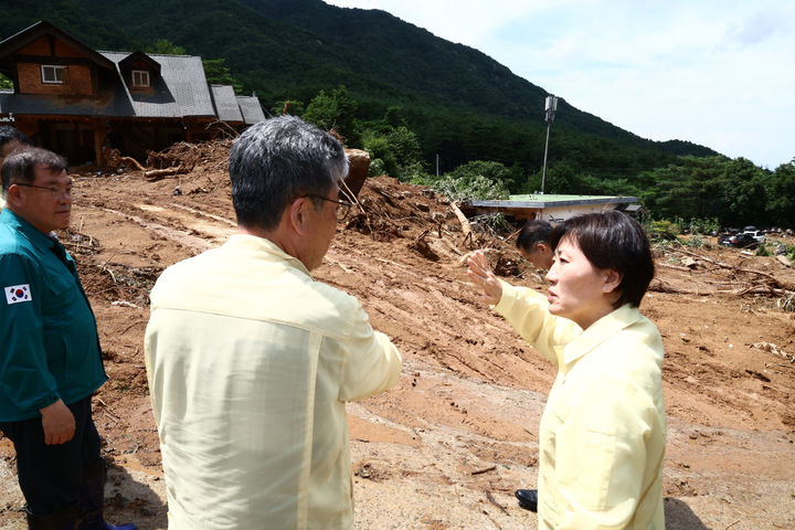 [산청=뉴시스] 강종민 기자 = 송미령 농림축산식품부 장관이 20일 경남 산청군의 산사태 현장을 찾아 피해 상황을 점검하고 있다. (사진=농식품부 제공) 2025.07.20. [email protected] *재판매 및 DB 금지