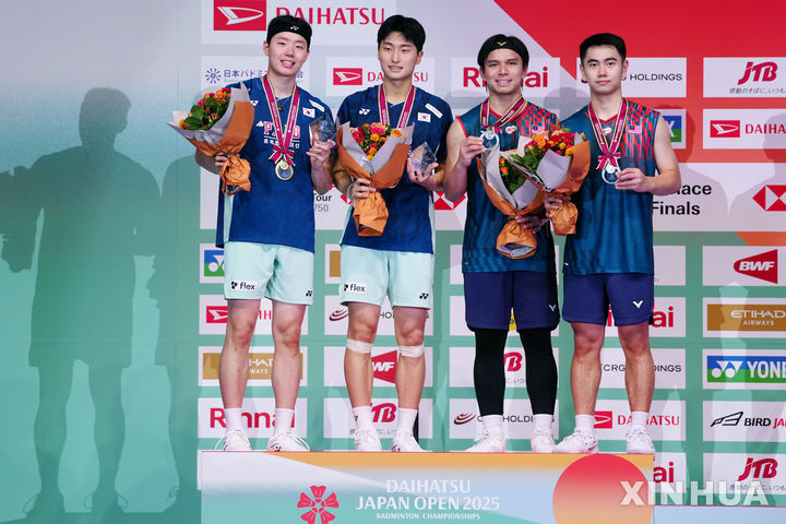 [도쿄=신화/뉴시스] 김원호-서승재(왼쪽)가 20일 일본 도쿄 메트로폴리탄 체육관에서 열린 2025 세계배드민턴연맹(BWF) 월드투어 슈퍼 750 일본오픈 남자 복식에서 우승, 시상대에 올라 기념 촬영하고 있다. 김원호-서승재 조(3위)는 결승에서 고제페이-누르이주딘 조(1위·말레이시아)를 2-0(21-16 21-17)으로 꺾고 우승하며 시즌 5승을 기록했다. 2025.07.21.