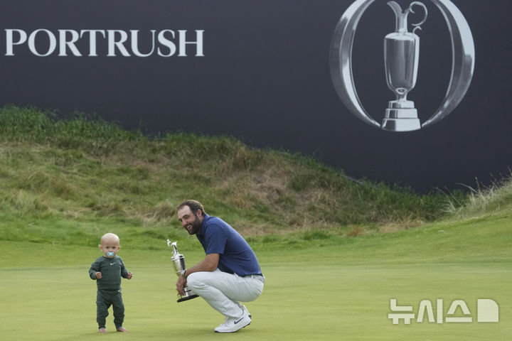 [포트러시=AP/뉴시스] 스코티 셰플러(미국)가 20일(현지 시간) 북아일랜드 포트러시의 로열 포트러시 골프클럽에서 열린 제153회 디오픈(브리티시오픈) 정상에 올라 트로피를 들고 아들 베넷과 기쁨을 나누고 있다. 셰플러는 최종 합계 17언더파 267타로 우승하며 올해 메이저 대회 두 번째 정상에 올랐다. 2025.07.21.