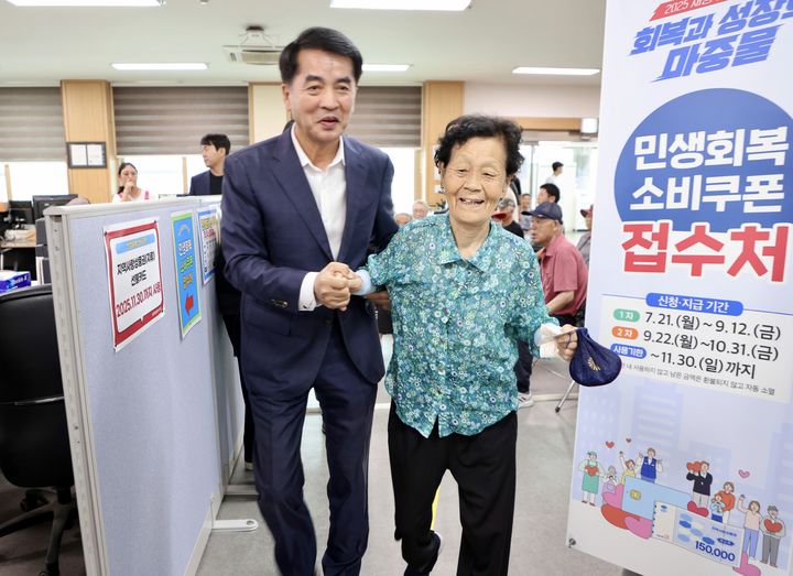 [보은=뉴시스] 민생회복 소비쿠폰 신청이 시작된 21일 오전 최재형(왼쪽) 충북 보은군수가 보은읍 행정복지센터에서 주민을 안내하고 있다. (사진=보은군 제공) 2025.07.21. [email protected]