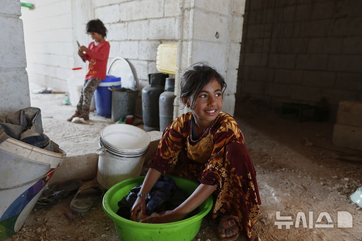 [부스라 알하리르=AP/뉴시스] 베두인 부족과 드루즈 민병대 간 충돌로 가족과 함께 집을 떠난 한 베두인 소녀가 20일(현지 시간) 시리아 수웨이다 북서쪽 부스라 알하리르 마을 임시 대피소에서 빨래하고 있다. 2025.07.21.