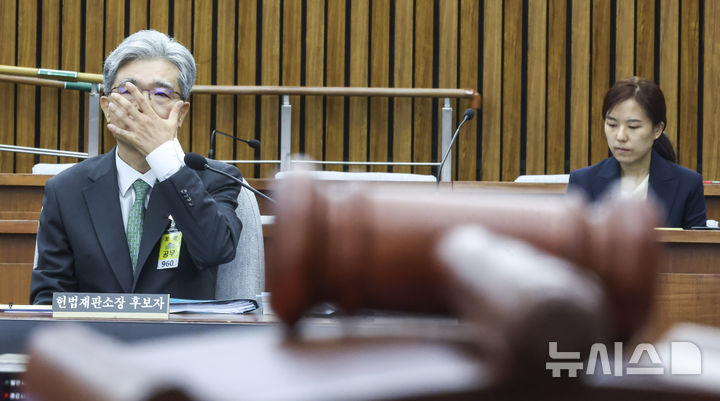 [서울=뉴시스] 고승민 기자 = 김상환 헌법재판소장 후보자가 21일 서울 여의도 국회에서 열린 인사청문특별위원회에 출석해 자리에 앉아 있다. 2025.07.21. [email protected]