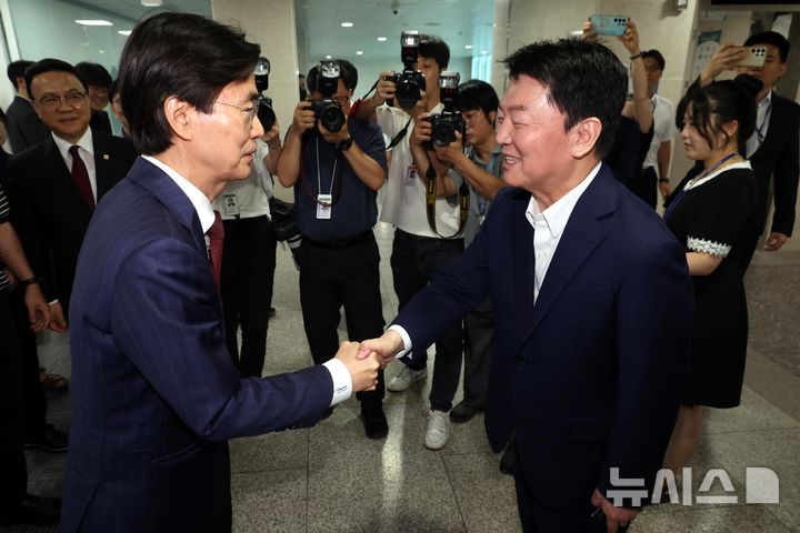 [서울=뉴시스] 조성봉 기자 = 조경태 국민의힘 의원이 21일 오전 서울 여의도 국회 소통관에서 당대표 출마선언 기자회견에 앞서 안철수 의원과 악수하고 있다. 2025.07.21. [email protected]