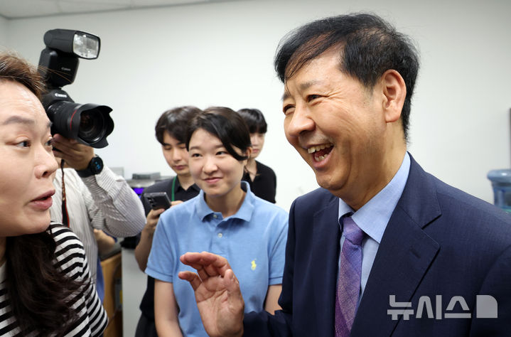[세종=뉴시스] 강종민 기자 = 구윤철 부총리 겸 기획재정부 장관이 21일 세종시 정부세종청사 출입기자실을 방문, 기자들의 질문이 쏟아지자 난처한 표정을 짓고 있다. 2025.07.21. [email protected]
