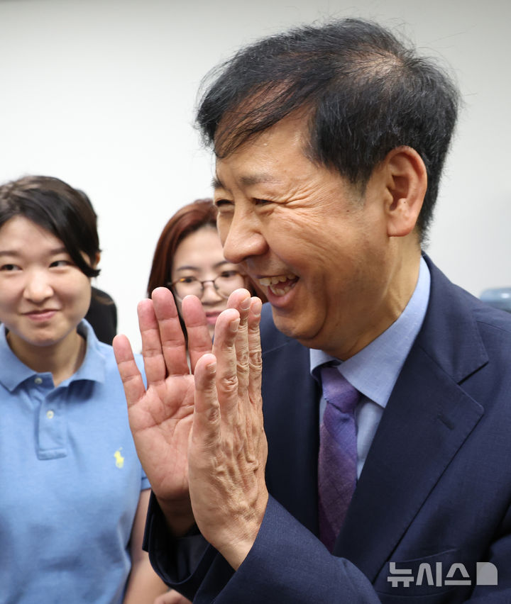[세종=뉴시스] 강종민 기자 = 구윤철 부총리 겸 기획재정부 장관이 21일 세종시 정부세종청사 출입기자실을 방문, 기자들의 질문이 쏟아지자 난처한 표정을 짓고 있다. 2025.07.21. [email protected]