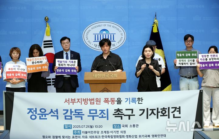 [서울=뉴시스] 조성봉 기자 = '서부지법 폭동'을 기록한 정윤석 감독이 21일 오전 서울 여의도 국회 소통관에서 열린 무죄 탄원 관련 기자회견에서 발언을 하고 있다. 2025.07.21. [email protected]