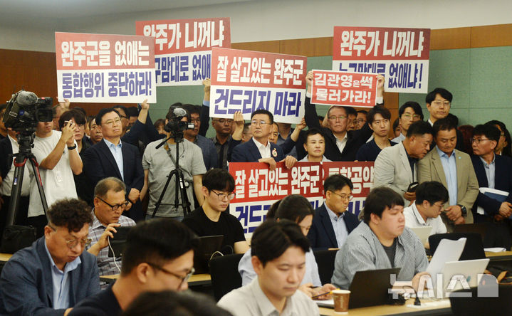 [전주=뉴시스] 김얼 기자 = 완주군의회 의원들을 비롯한 완주-전주 통합을 반대하는 군민들이 21일 전북 전주시 전북특별자치도청 기자회견장에서 열린 완주-전주 통합과 관련한 기자회견을 청취하며 손피켓을 들고 있다. 2025.07.21. [email protected]