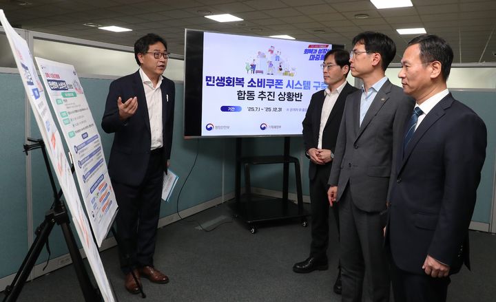 [서울=뉴시스] 김민재 행정안전부 차관이 21일 오전 서울시 마포구 한국지역정보개발원에 마련된 '민생회복 소비쿠폰 시스템 구축 합동 추진 상황반'을 찾아 대응현황을 보고받고 있다. (사진=행정안전부 제공) 2025.07.21. [email protected] *재판매 및 DB 금지