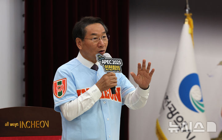 [서울=뉴시스] 전진환 기자 = 유정복 인천시장이 APEC 2025 인천회의 자원봉사자 발대식이 열린 21일 오후 인천 남동구 인천시청 대회의실에서 참석자들에게 인사말을 하고 있다.