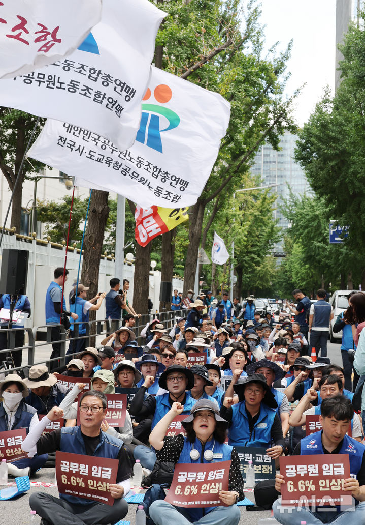[서울=뉴시스] 김명원 기자 = 대한민국공무원노동조합총연맹(위원장 석현정, 공노총)이 21일 서울 종로구 정부서울청사 일대에서 공무원 임금인상 쟁취 3차 간부결의대회를 하고 있다. 2025.07.21. [email protected]