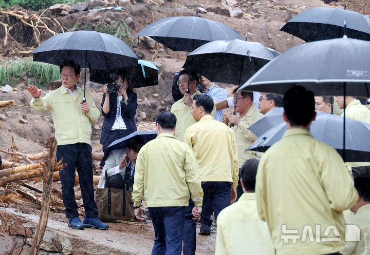 [산청=뉴시스] 고범준 기자 = 이재명 대통령이 21일 기록적인 폭우가 쏟아진 경남 산청군 산청읍 부리마을을 찾아 피해 현장을 점검하고 있다. 2025.07.21. [email protected]