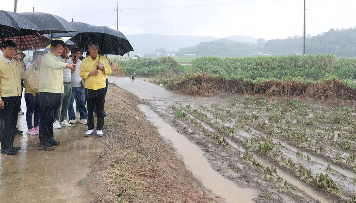 [영광=뉴시스] 강종민 기자 = 권재한 농촌진흥청장이 21일 전남 영광군의 한 수해지역을 찾아 농작물 침수 피해 상황과 지원 방안을 점검하고 있다. (사진=농진청 제공) 2025.07.21. [email protected] *재판매 및 DB 금지