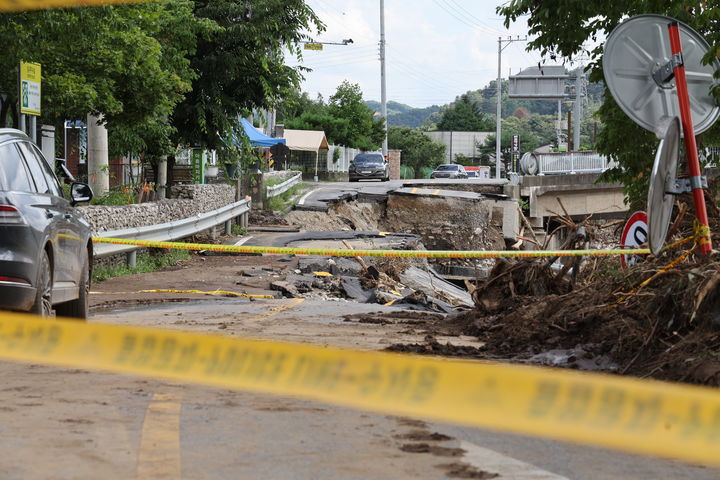 [서울=뉴시스] 고승민 기자 = 21일 경기 가평 용추계곡 인근 수해지역 도로가 붕괴돼 있다. (사진=국민의힘 제공) 2025.07.21. [email protected] *재판매 및 DB 금지