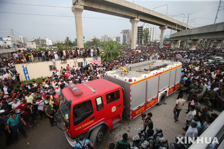 [다카=신화/뉴시스] 21일(현지 시간) 방글라데시 다카에서 방글라데시 공군 훈련기가 한 학교에 추락한 후 소방관들이 현장에 출동하고 있다. 현지 당국은 중국산 F-7 BGI 훈련기가 '마일스톤 스쿨 앤드 칼리지' 건물에 추락해 조종사 포함 최소 19명이 숨지고 약 170명이 다쳤다고 밝혔다. 방글라데시 정부는 22일을 국가 애도의 날로 선포했다. 2025.07.22.
