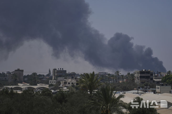 [데이르알발라=AP/뉴시스] 21일(현지 시간) 가자지구 중부 데이르알발라에서 이스라엘군의 폭격으로 연기가 피어오르고 있다. 이스라엘군이 데이르알발라에서 개전 후 처음으로 전차와 장갑차를 투입하며 지상 작전을 실행했다. 2025.07.22.