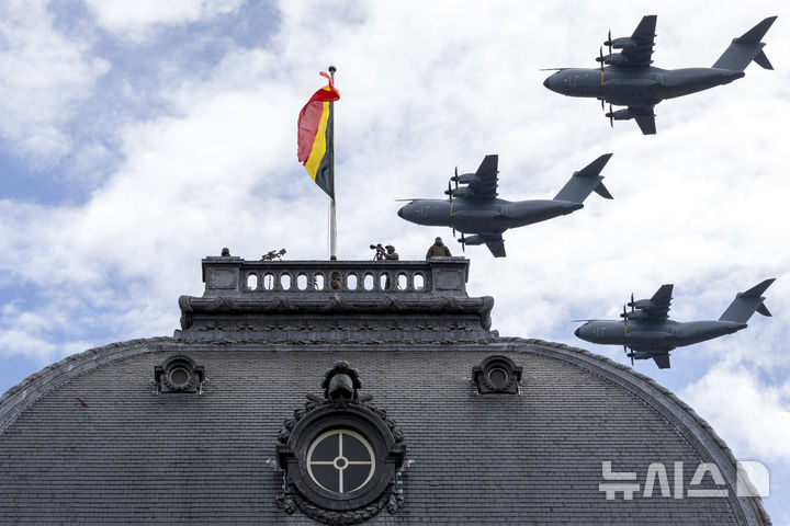 [브뤼셀=AP/뉴시스] 벨기에 국경일인 21일(현지 시간) 벨기에군 항공기들이 저격수들이 배치된 브뤼셀 왕궁 상공에서 축하 비행을 펼치고 있다. 벨기에 국경일은 1831년 7월 21일 벨기에가 네덜란드로부터 독립한 뒤 초대 국왕 레오폴트 1세가 즉위한 날을 기념한다. 2025.07.22.