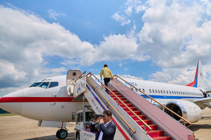 [서울=뉴시스] 대통령실은 이재명 대통령이 지난 21일 호우 피해지역 방문을 위해 전용기에 탑승하고 있는 모습을 22일 SNS에 공개했다. (사진=이재명 대통령 SNS) 2025.07.22. [email protected] *재판매 및 DB 금지