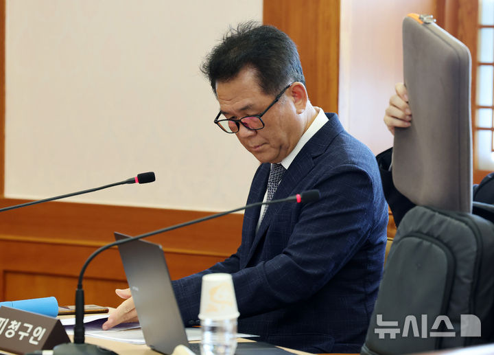 [서울=뉴시스] 배훈식 기자 = 조지호 경찰청장 탄핵심판 피청구인 측 법률대리인인 노정환 변호사가 22일 오후 서울 종로구 헌법재판소 소심판정에서 열린 2차 변론준비기일에서 자료를 살피고 있다. 2025.07.22. [email protected]